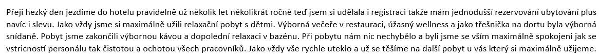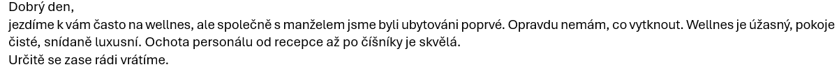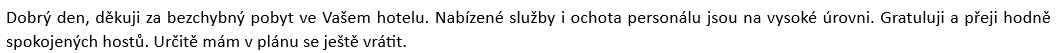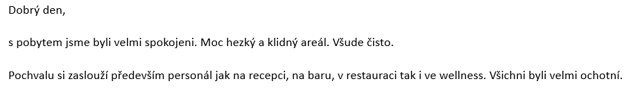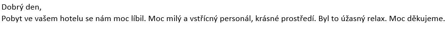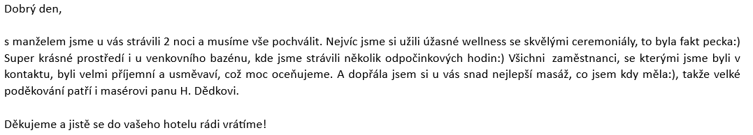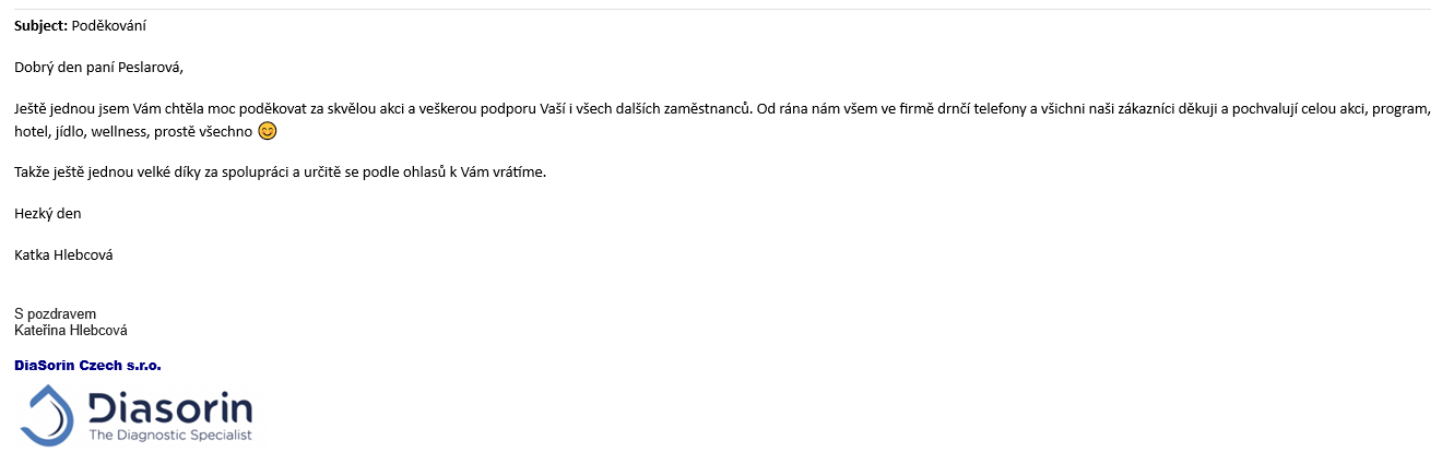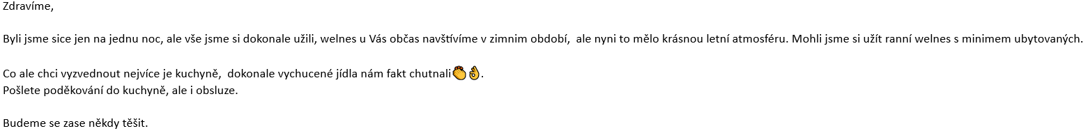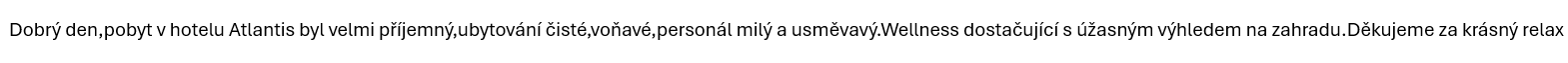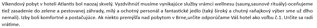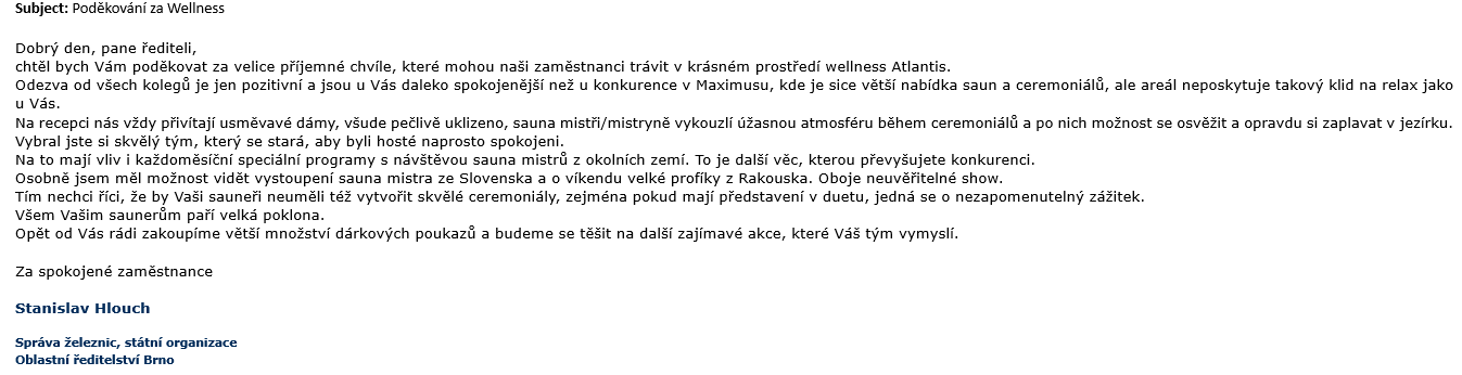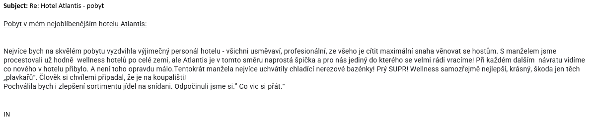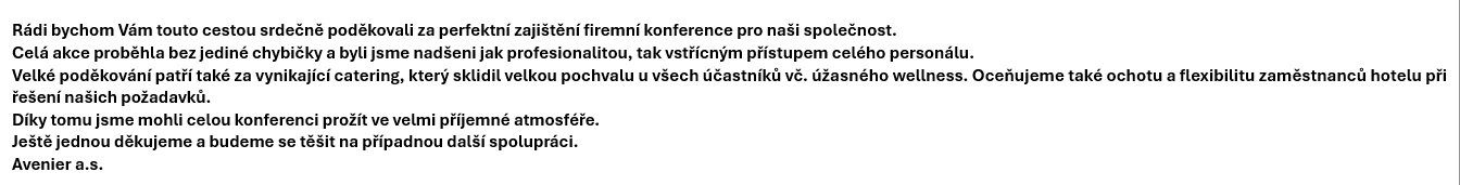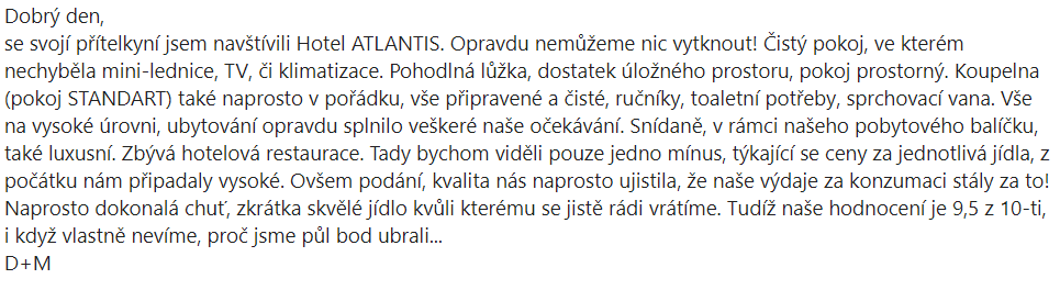 Nedávno jsme uspořádali náš kongres v hotelu Atlantis v Brně. Zážitek byl vynikající od začátku do konce. Tým hotelu byl neuvěřitelně profesionální a vstřícný. Moderní, klimatizované konferenční prostory výrazně přispěly k pohodlí účastníků kongresu. I ostatní prostory byly špičkové a poskytovaly pohodlné a příznivé prostředí pro náš mezinárodní kongres, připravené občerstvení a zábavu. Cateringové služby byly výjimečné a nabízely rozmanité menu, které uspokojilo všechny dietní preference a potřeby. Jídlo bylo chutné a krásně prezentované, což přispělo k celkovému úspěchu naší akce. Naši účastníci byli také ohromeni kvalitou ubytování. Pokoje byly prostorné, čisté a dobře vybavené a poskytovaly pohodlný pobyt všem zúčastněným. Účastníci také ocenili a naplno využívali wellness hotelu. Zvláštní poděkování patří celému personálu za jejich dokonalé služby a pozornost ke každému detailu. Nemohli jsme si přát lepší místo pro náš kongres a vřele doporučujeme Hotel Atlantis pro jakoukoli akci nebo pobyt. Těšíme se na budoucí akce!